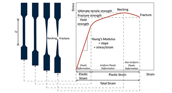 Force, displacement, and “strain” (how much the material stretches), are measured, and the strain-stress curves are graphically displayed to give insight on a myriad of material properties.