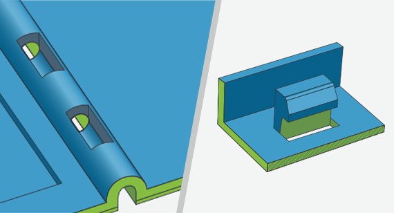 In the next set of illustrations, Figure 2A shows a through hole across a 4 inch-wide part. With side-action pull-length limitations, or to try to reduce the overall cost of the mold by removing the need for a side-action, you need to be creative at times. Creating a segmented trough on the A-side (in green) and a corresponding segmented trough on the B-side (in blue) creates a series of shut offs that form a through hole across the entire part. This works especially well for hinges, bolt holes, pivot pins, etc.